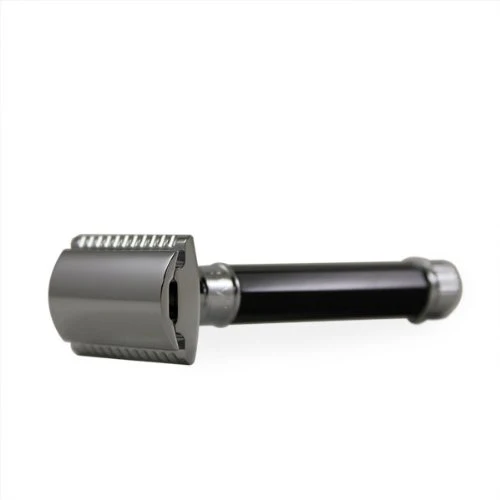 This classic double-edge razor by Edwin Jagger has an elegant, faceted handle in faux-ebony acrylic with chrome-plated fittings. The neck of the razor is engraved with the Edwin Jagger brand. Its precision closed-comb shaving head has a classic straight guard, providing a perfect shave with no irritation.